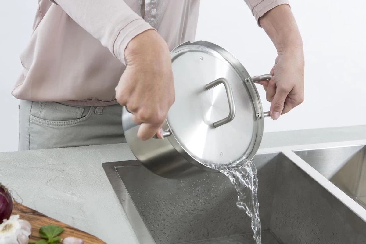 De pannen uit de BK Q-linair Master pannenset – 5-delig beschikken over een veilig afgietsysteem waardoor je gemakkelijk en veilig je pannen kunt afgieten. De deksels kunnen met een draai onder de grepen worden vergrendeld. Zo kunnen vloeistoffen veilig worden afgegoten of uitgeschonken worden via de schenktuit in de rand. Veilig afgieten was nog nooit zo makkelijk!
