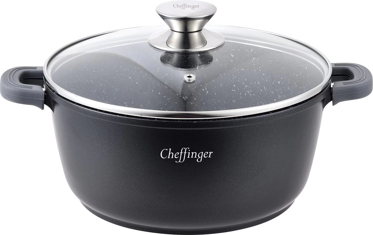 Met deze Cheffinger braadpan bereid je de lekkerste gerechten. De pan is gemaakt van gegoten aluminium en voorzien van een 3-laags marmeren coating en afneembare silicone handvaten. Hij kan gebruikt worden op alle type warmtebronnen en kan tevens in de oven tot een temperatuur van 220 graden. De meegeleverde deksel is gemaakt van gehard glas en heeft roestvast stalen knop.
