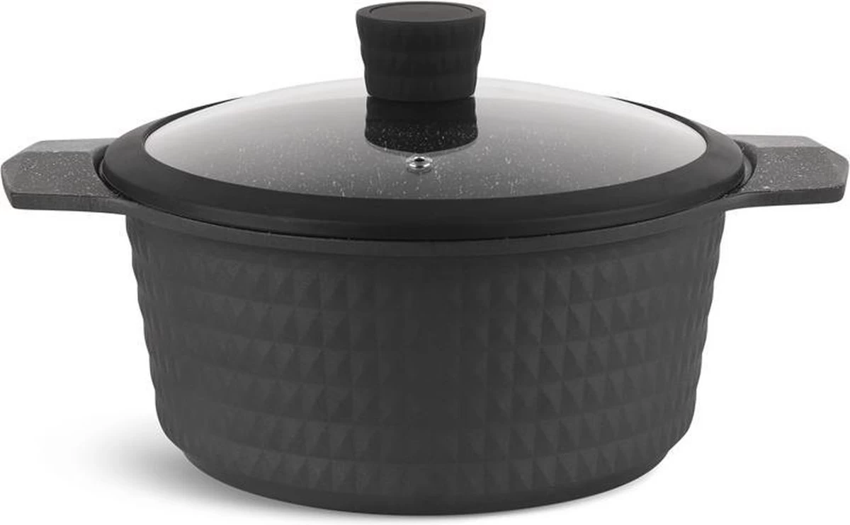 - Gegoten aluminium, met keramische/marmeren coating, ideaal tegen aanbraden, en vetarm koken