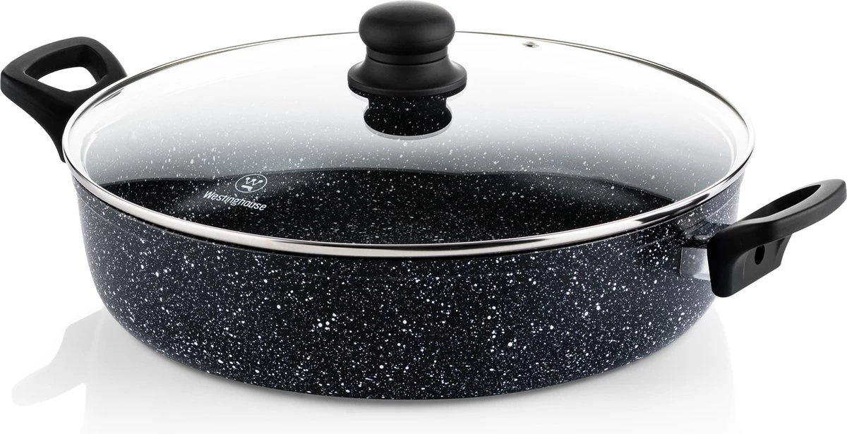 De Westinghouse Zwart Marmer Hapjespan 32cm mag niet ontbreken aan jouw pannencollectie. De hapjespan is ideaal voor het bereiden van bijvoorbeeld eenpansgerechten, een lekkere risotto, paella of een heerlijke pastasaus. De pan is gemaakt uit aluminium en licht in gewicht. Zo verplaats je de hapjespan gemakkelijk van de warmtebron rechtstreeks naar de tafel.